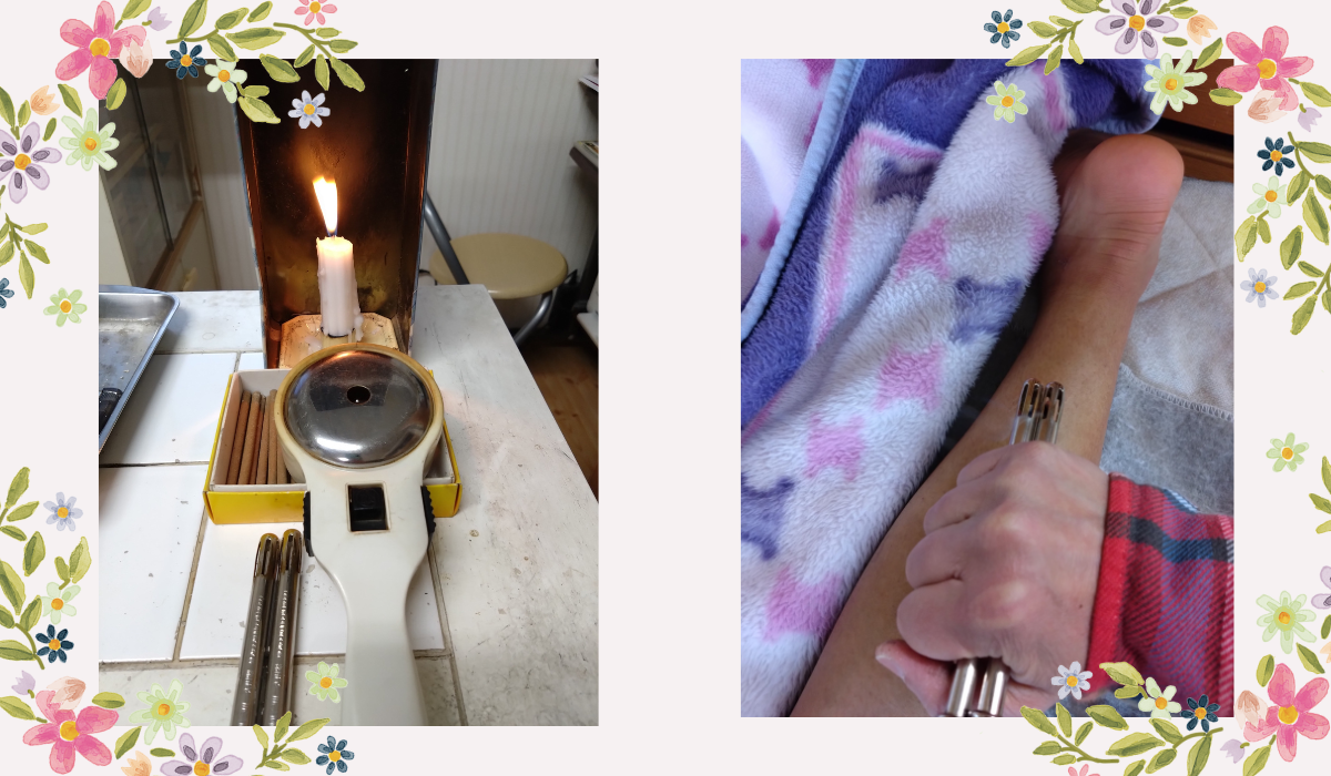 数種類の薬草(漢方)を線香状にしたものを点火し、その薬草の成分と熱を肌にあて、体を温める療法です。